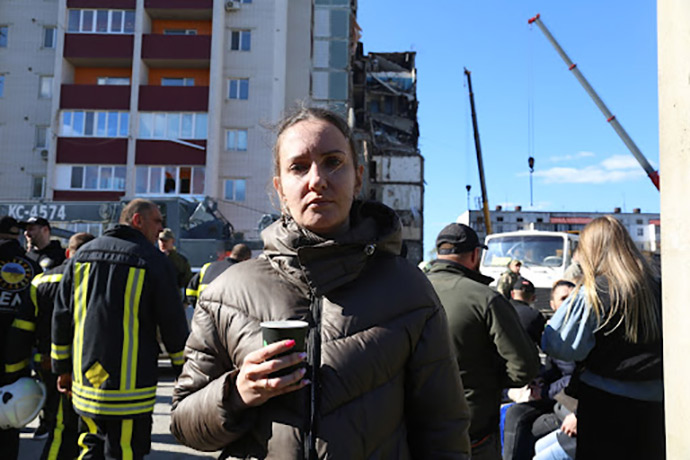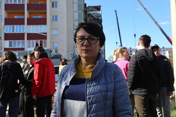 Поки рятувальники розбирають завали, неподалік зруйнованої багатоповерхівки зустрічаю Наталю Чепелівську. Вона ледь говорить і час від часу під час нашої розмови робить паузи через сльози.