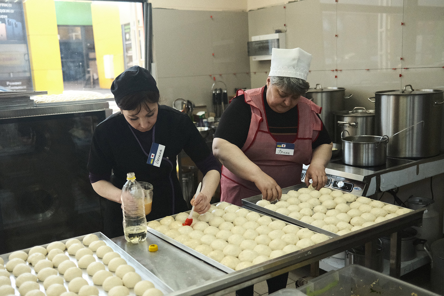 У сусідньому приміщенні тим часом кипить робота. Одна кухарка перекладає з жаровні на тацю тільки-но приготовлені гарячі булочки, інша розмішує у великій каструлі салат. За пів години, о 12:00, з вікна FuMi Caffe протягом трьох годин безкоштовно роздаватимуть їжу.