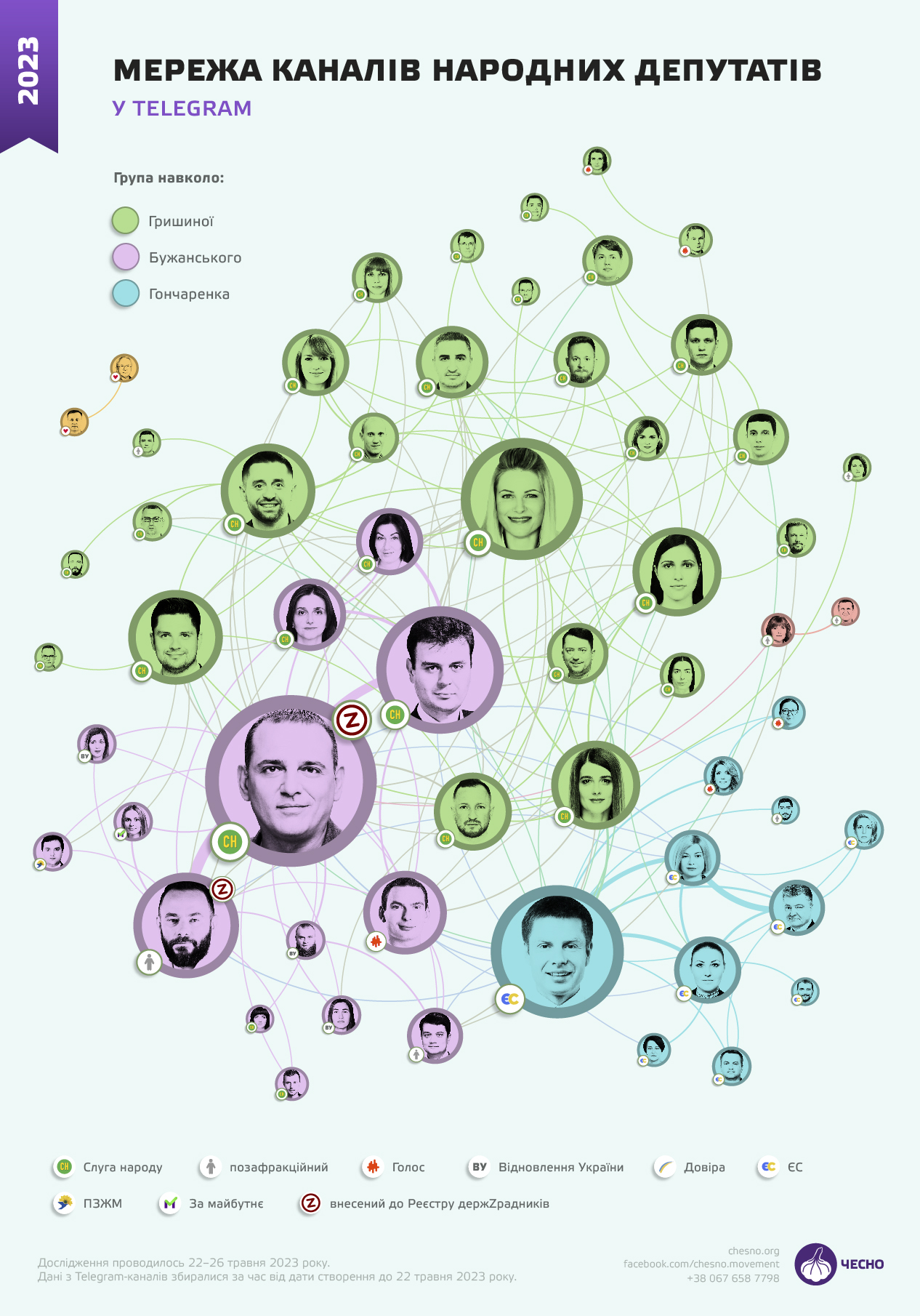 У контексті мережі каналів ми зважали на репости з обох сторін – якщо, наприклад, один народний депутат репостив колегу, а той у відповідь ні, то зв'язок між ними є одностороннім. Також враховувалися вже видалені дописи. Так, наприклад, Олександр Дубінський репостив Ярослава Железняка, проте допис на каналі видалили. Железняк Дубінського не репостив.