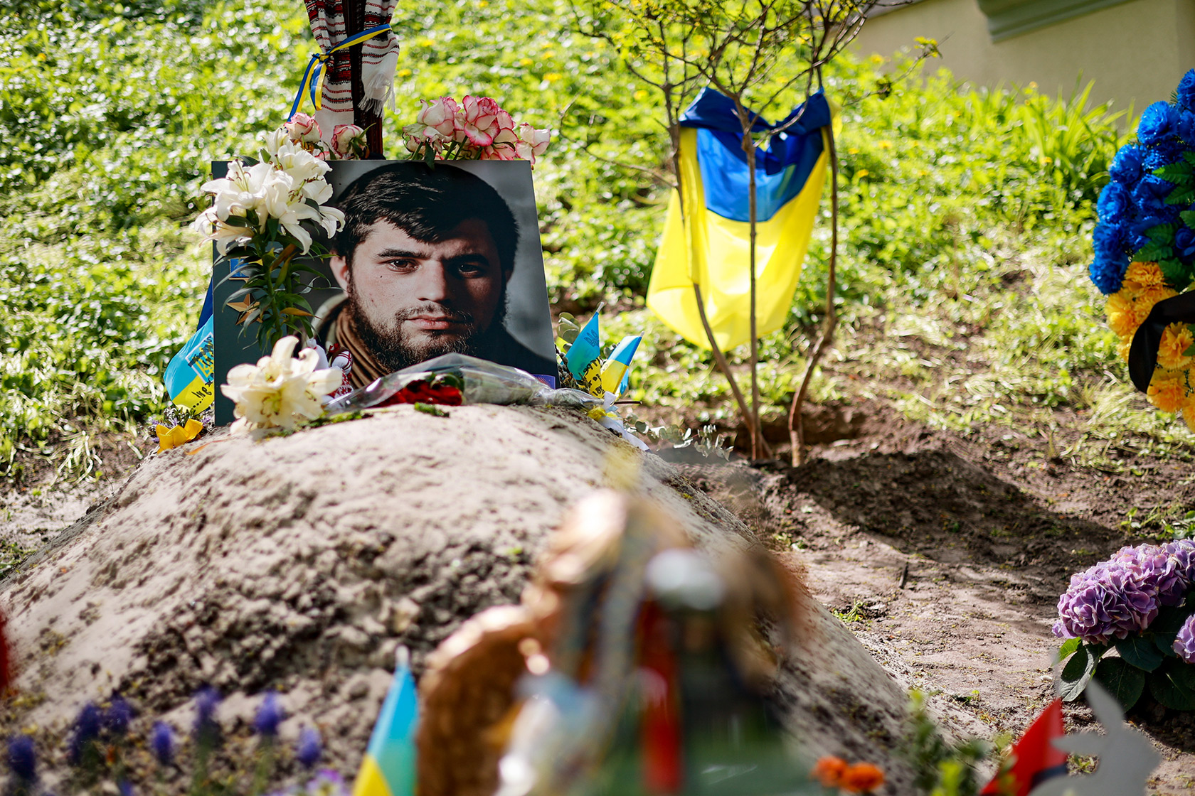 Священник відспівує ще одного полеглого у цій війні воїна – 44-річного Євгена Кваскова, який загинув наприкінці квітня під Бахмутом. Молитва лунає, розчиняючись у тихому, стриманому плачі присутніх.