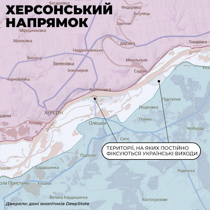За даними УП, Сили оборони висуваються на окупований берег щонайменше з березня цього року. 29 серпня стало відомо, що військові символічно підняли український прапор у районі дач, що розташований по той бік Антонівського мосту.