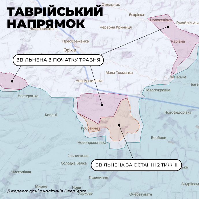 - Таврійський (наступальні дії почались у червні). Українські військові не без складнощів, але прориваються до головної укріпленої лінії оборони росіян, так званої "лінії Суровікіна", одразу в двох точках: під Великою Новосілкою та в районі нещодавно звільненого Роботиного.