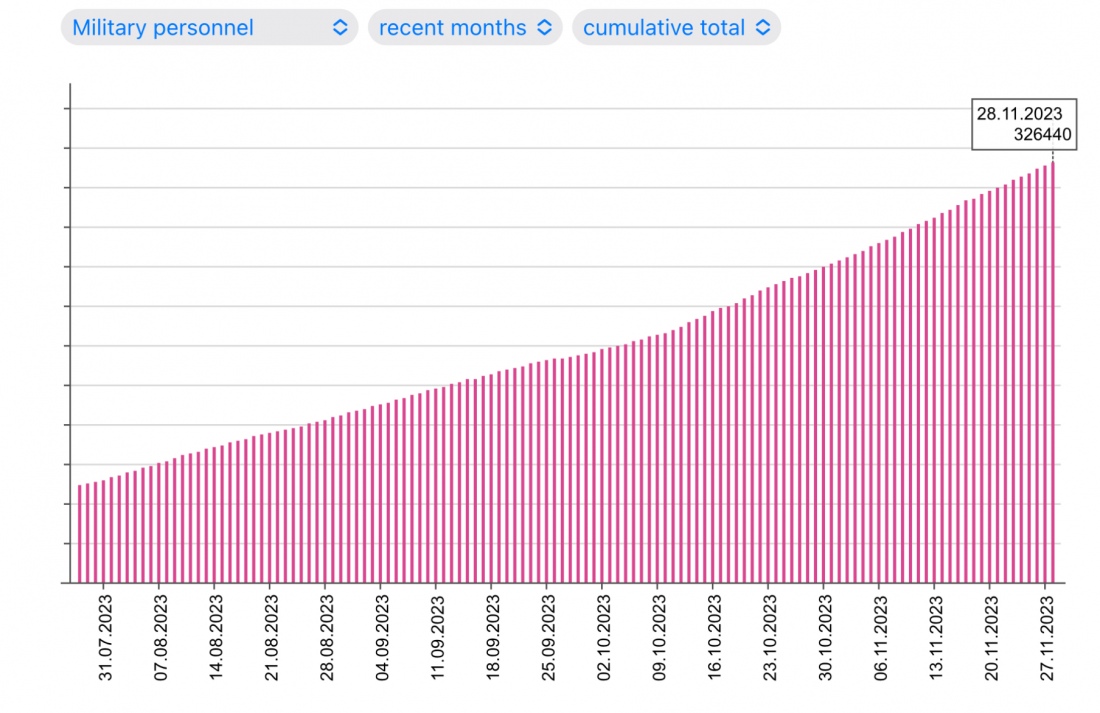 За українськими даними, кількість втрат російських солдатів станом на 27 грудня 2023-го складає орієнтовно 355 тисяч. За даними американських аналітичних видань, з посиланням на посадовців США, з боку Росії загинуло менше: 120 тисяч станом на серпень 2023, решта – поранені.