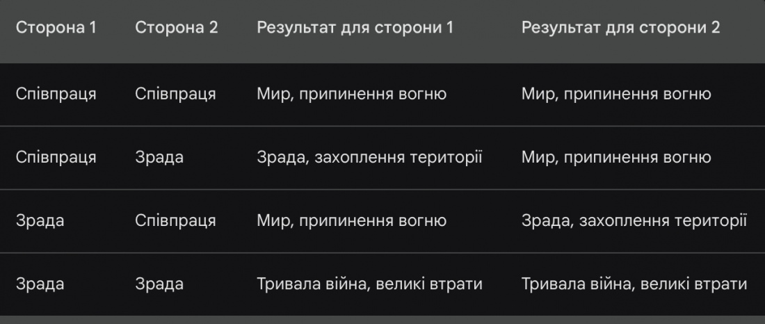 Якщо обидві сторони нападатимуть, то вони обидві отримають більше втрат, аніж якби примирились.