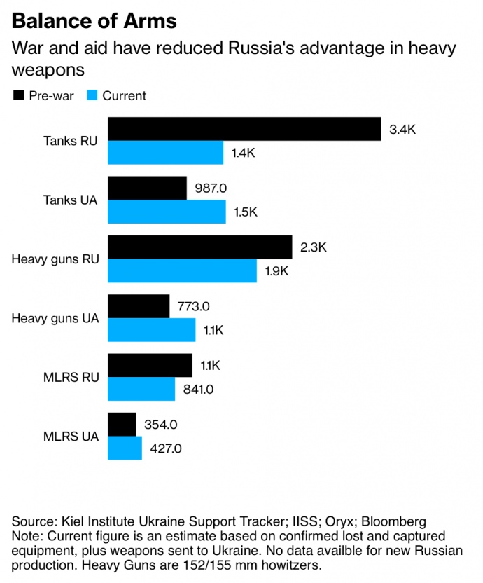 Завдяки втратам Росії та зовнішнім надходженням в Україну ситуація зі зброєю на полі бою майже зрівнялась, зокрема в танках, важкій артилерії та MLRS.