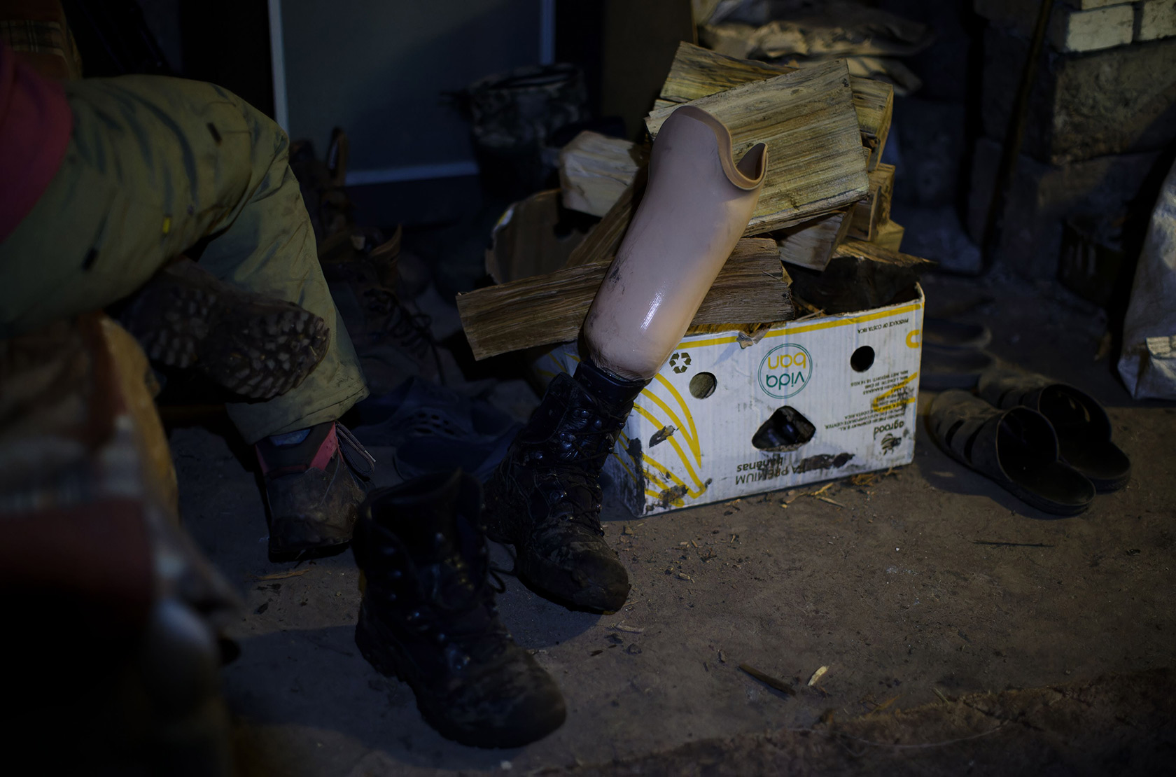 Щоночі лягаючи на широке двоспальне ліжко в одному з підвалів Часового Яру, військовослужбовець Андрій знімає з себе піксельний кітель, чорні берці та свою ліву ногу. Він обпирає її об купу свіжих дров і відкидається на бильце ліжка.