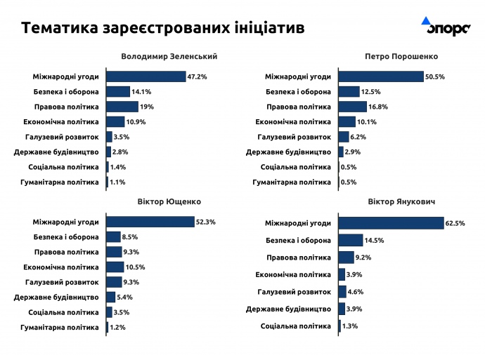 Усі досліджувані президенти були найактивнішими у сфері міжнародних угод та відносин. Наприклад, у Зеленського на цю тематику припадає 47% від усіх поданих ініціатив. Також і нинішній, і попередні очільники держави досить активно реєстрували ініціативи, що стосувались тем безпеки й оборони, правової та економічної політики.