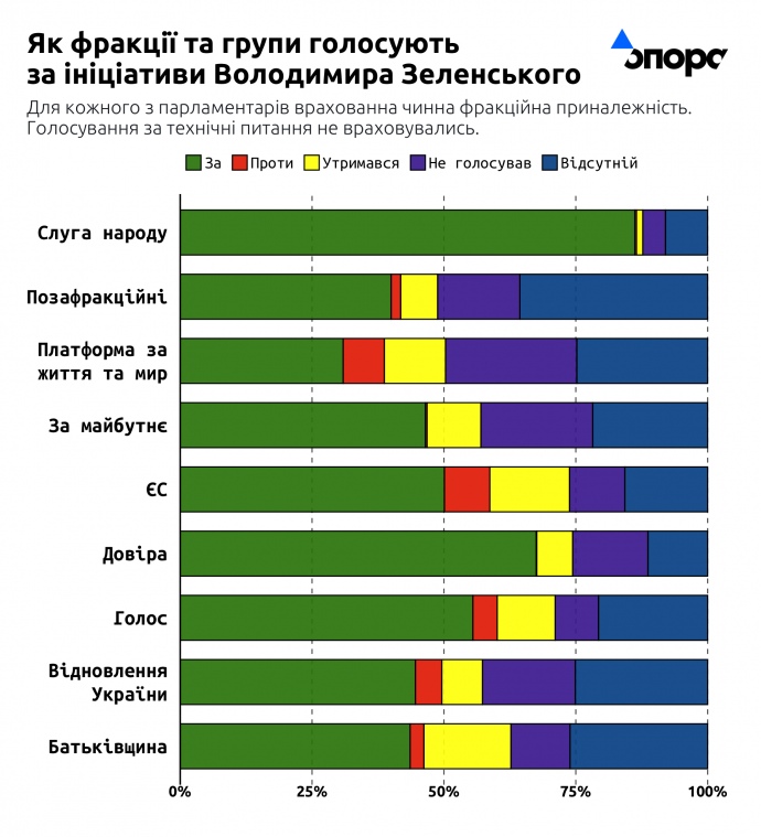 Характерною особливістю всіх голосувань парламенту за проєкти законів президентів, зрештою як і в цілому в парламенті, є також низький відсоток голосувань "проти". Він наразі складає трохи менше як 2%. Тобто, попри критику і невдоволення, коли доходить до голосування в парламенті, серйозні "противники" ініціатив Зеленського в Раді переважно мовчать.