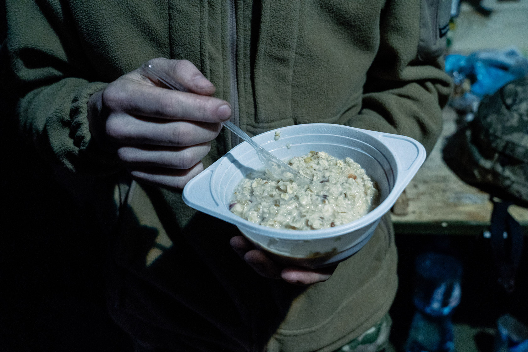 "На початку подобалися сухпайки нові, але (за цей час) їх стільки з'їв, що вже не лізуть", – усміхається він, відповідаючи на запитання про армійський раціон.
