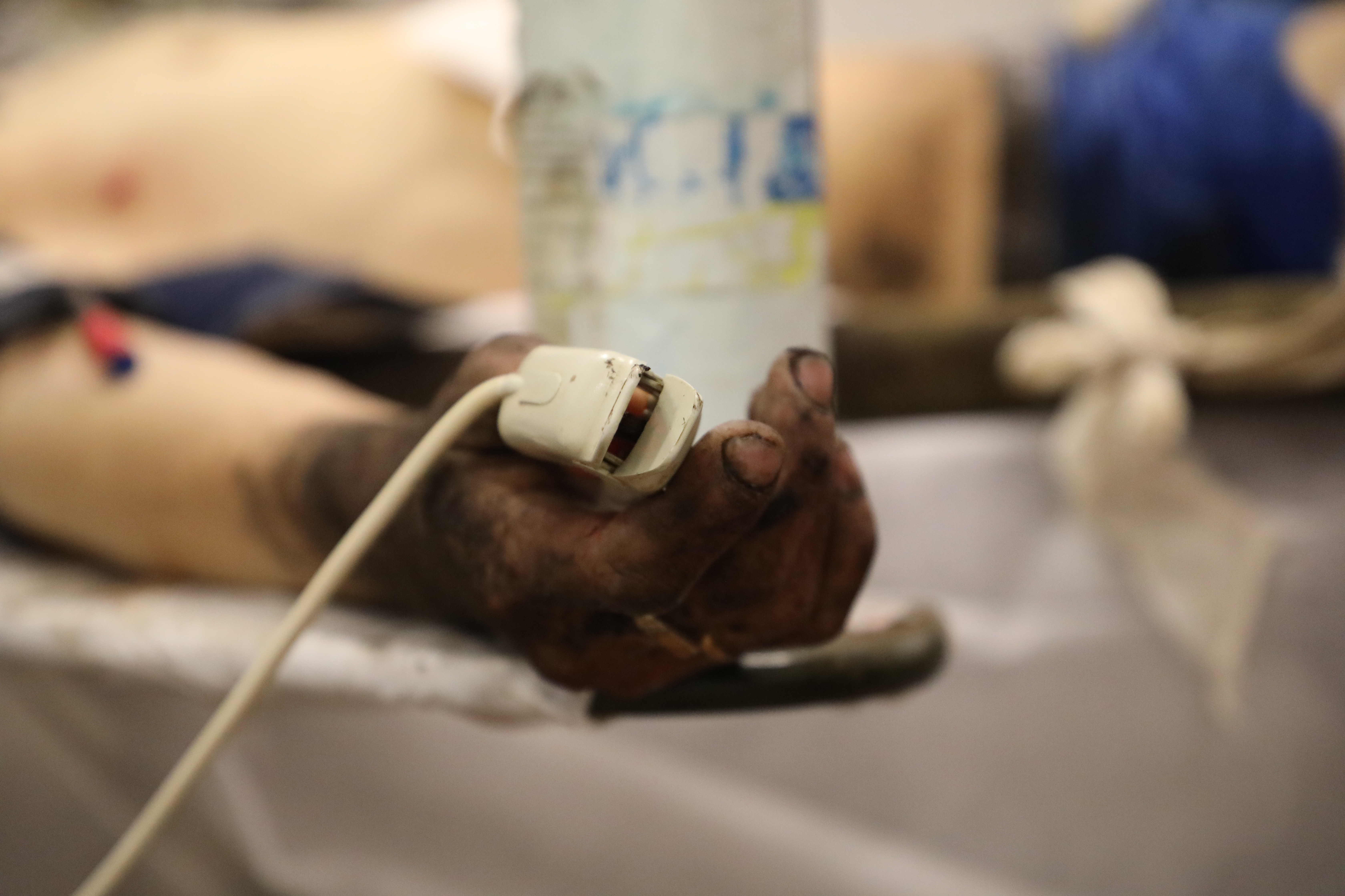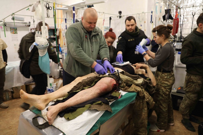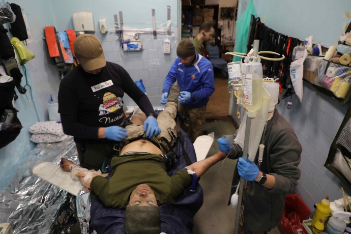 Одні медики обробляють рани та бинтують їх. Інші роблять прокол біля шиї, вводячи препарати. На почорнілій, мов вугілля, руці закріплено датчик для вимірювання тиску.