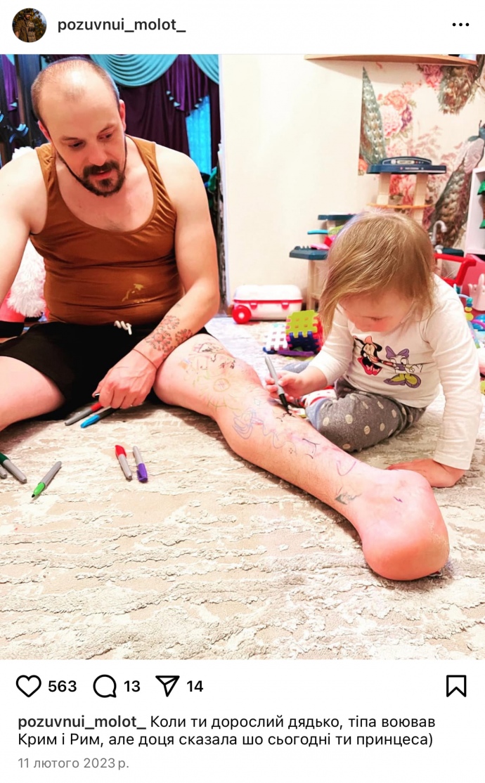 На світлині його 4-річна дочка Варвара фломастерами розмальовує ногу Миколи, частину якої довелося ампутувати після поранення на Херсонщині в 2022-му. Тоді він був поліцейським, нині – військовий, який воює на протезі.