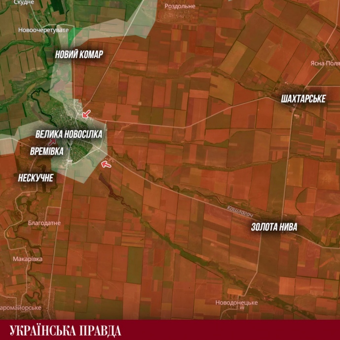 "Росіяни затискають нас з трьох боків – Времівки – Нескучного, Золотої Ниви – Шахтарського та Нового Комара. Вони будуть намагатися закривати оточення, хоч на це їм і треба багато сил", – пояснює в розмові з УП один із командирів на напрямку Великої Новосілки.