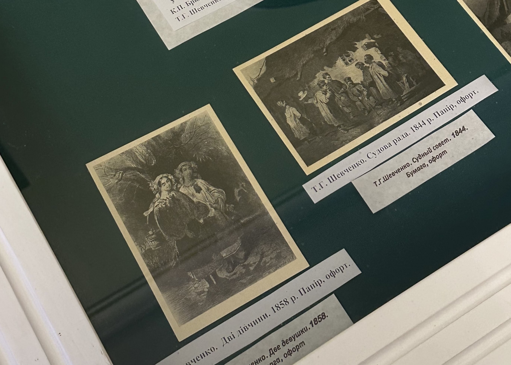 Неочікувано в останній залі помічаю стенд з офортами і збірками творів Шевченка. Екскурсовод пояснює, що з ним Пушкін пов'язаний опосередковано через російського поета Василя Жуковського. В Одесі Тарас Шевченко ніколи не був, але за легендою фарби для малювання йому надсилали саме з цього портового міста.