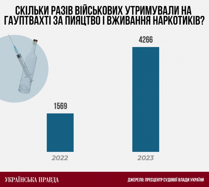 Згідно з цими даними, в 2023 році військових утримували на гауптвахті за вживання алкоголю або наркотиків майже втричі частіше, ніж у 2022-му.