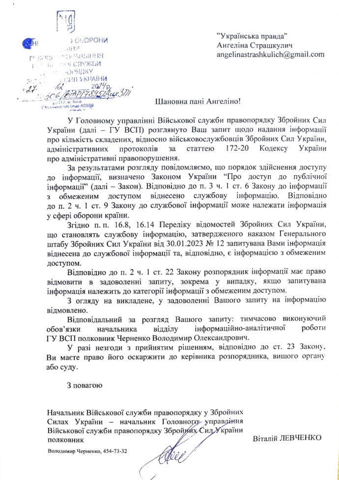 "Українська правда" намагалася з'ясувати, скільки протоколів за статтею 172-20 КУпАП склали на військових із початку великої війни.