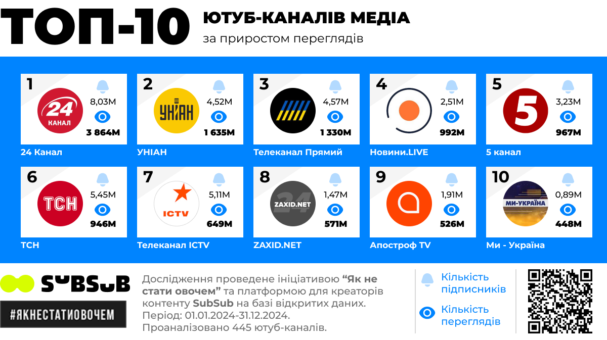 8 з 10 лідерів за переглядами інформаційного Ютубу в 2024 році це канали українських медіа. Решта – інформаційні канали, які агрегують новинний контент.