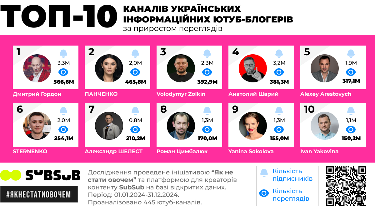 У 2024-му ми проаналізували, які медіа, інформаційні канали та блогери найбільше впливали на інформаційне поле. А також дослідили, коментарі яких експертів мали найгучніший голос у Ютубі. Аналіз здійснювався по каналах, у яких: понад 50 000 підписників; понад 5 мільйонів переглядів відео за весь період існування каналу; регулярні публікації відео на суспільно-політичну тематику.