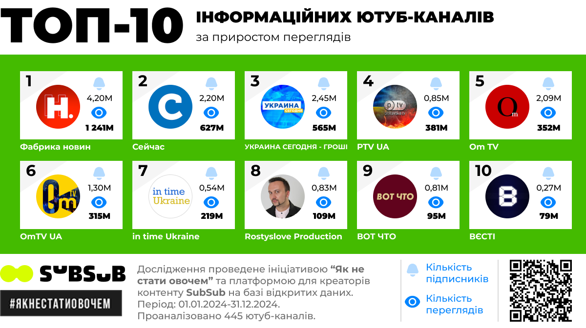 Ініціатива "Як не стати овочем" і платформа "SubSub" провели третю хвилю дослідження українського інформаційного Ютубу. Перша були в 2020-му році: тоді сумарні перегляди відео каналів з прямою чи завуальовано проросійською пропагандою майже у 2,5 рази перевищували канали з проукраїнською позицією. Але вже восени 2021 перегляди топових українських інформаційних ютуб-каналів були на 30% більші, ніж групи проросійських каналів.