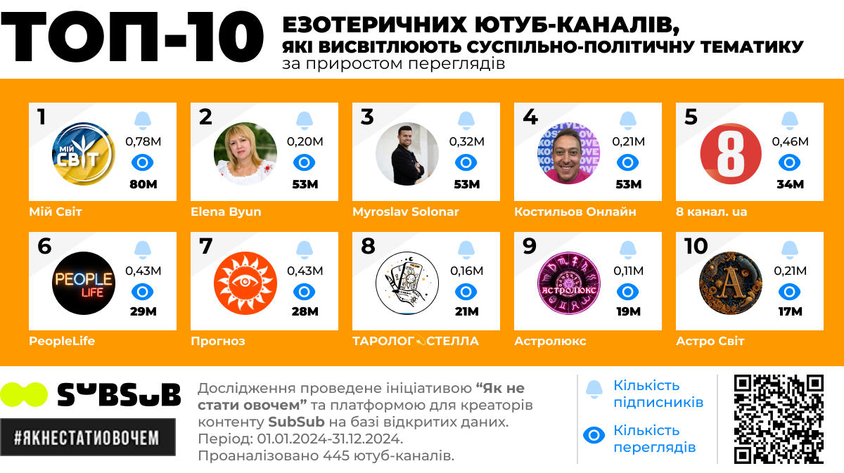 Загалом серед 445-ти найпопулярніших інформаційних каналів – 36 езотеричних. Їхні відео в 2024 році зібрали понад 1,8 мільярда переглядів.