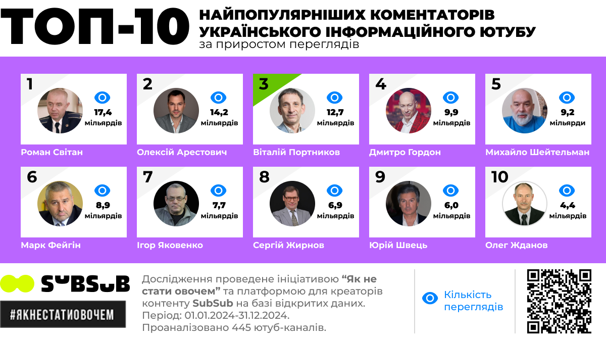 Загалом 61 зі 165 найпопулярніших коментаторів українського інформаційного Ютубу – або росіяни, або ті, хто був помічений у поширенні маніпуляцій. Відео, в яких згадувалися їхні прізвища, в 2024 році подивилися понад 118 мільярдів разів. Це 62% від всіх переглядів відео з найпопулярнішими коментаторами.