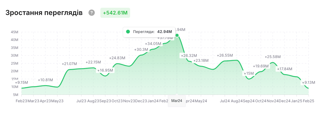Примітка: тут і далі під середніми переглядами відео мається на увазі показник медіани переглядів одного відео за 2024 рік.