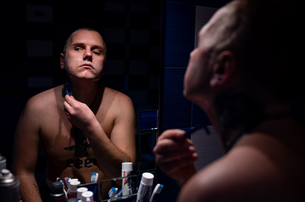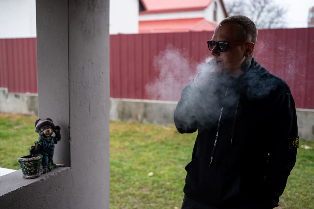 Автобус привозить співробітників реабілітаційного центру під самі двері. Як водиться, робочий день стартує з перекуру. Олег зупиняється перед входом і запалює цигарку сірником. Рукою намацує кут будівлі, трохи подається вперед і розтискає пальці ‒ сірник падає в урну.