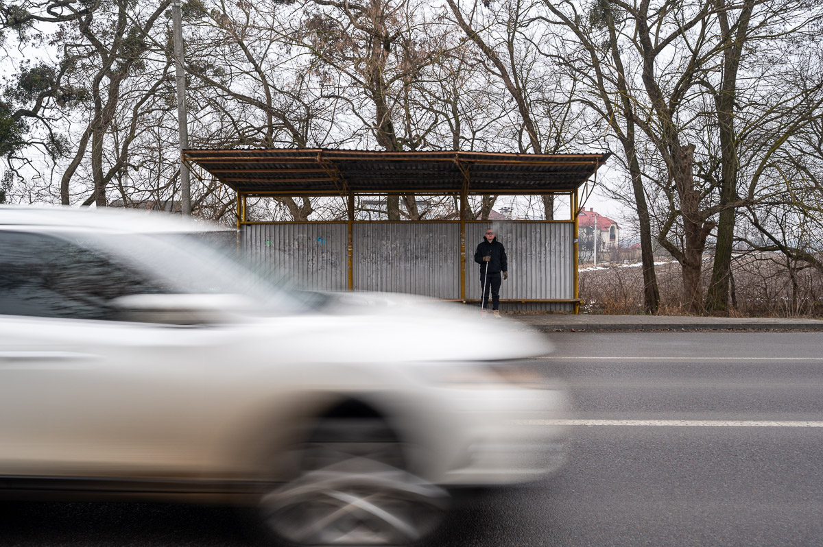 Але чотири рази на тиждень цю трасу доводиться переходити, щоб дістатися зупинки, де Олега підбирає службовий автобус. Він працює масажистом у реабілітаційному центрі в сусідньому селищі Великий Любінь. Автобус прибуває за розкладом і попереду пів години дороги.