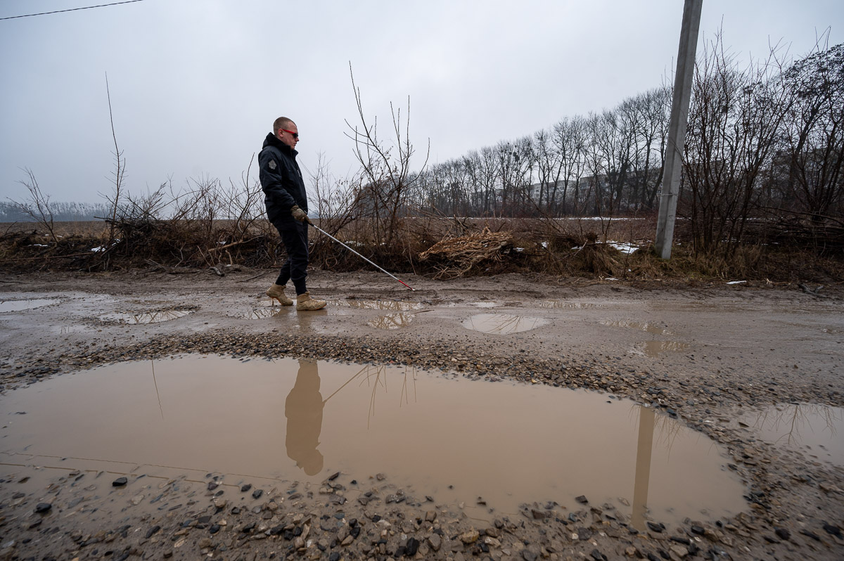 Виходимо з подвір'я й Олег починає обстежувати шлях тростиною. Дороги немає, під ногами глибокі калюжі та залишки розталої криги. Оминати все це непросто навіть зрячій людині. У місцевій адміністрації вже рік як обіцяють зробити тверде покриття на його вулиці, але далі обіцянок справа досі не зайшла.