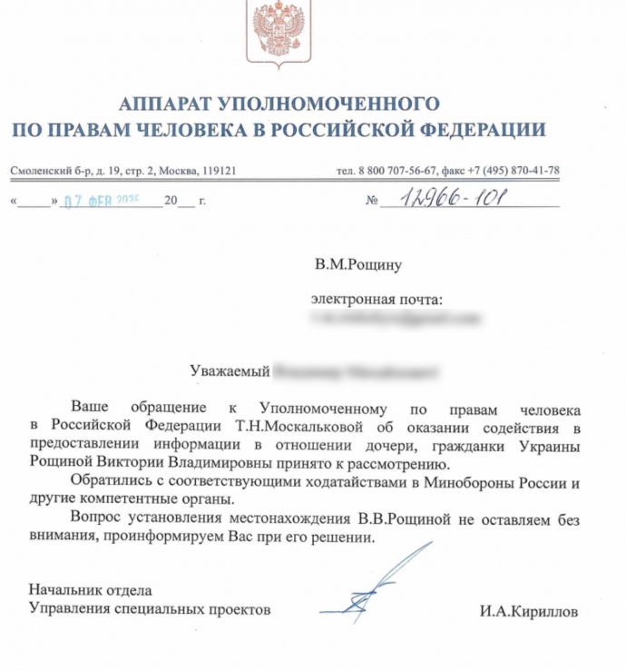 "Вопрос установления местонахождения В. В. Рощиной не оставляем без внимания, проинформируем о его решении", – йдеться в документі.