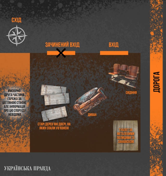 "Інші в'язні помогли мені відмитися від крові. Виявилося, що тут були люди, які сиділи понад 20 діб. Гараж був не маленький: 10 на 5 метрів, збудований з каменю. Було двоє залізних воріт, у кутку за целофановою завісою – відро-туалет. Під стіною – крісла з відкидними сидіннями. На полу лежало 3–4 штуки старих дерев'яних дверей із старими ковдрами. По центру – старий диван. На них ми спали", – описує свою "камеру" Віталій.