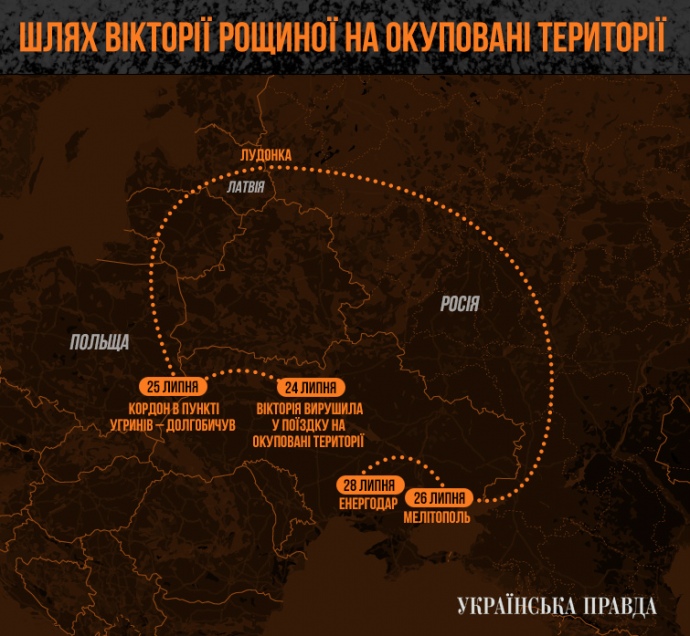 Нам вдалося встановити, що Вікторія вирушила в поїздку на окуповані території 24 липня. Вночі 25 числа вона перетнула кордон у пункті Угринів – Долгобичув.