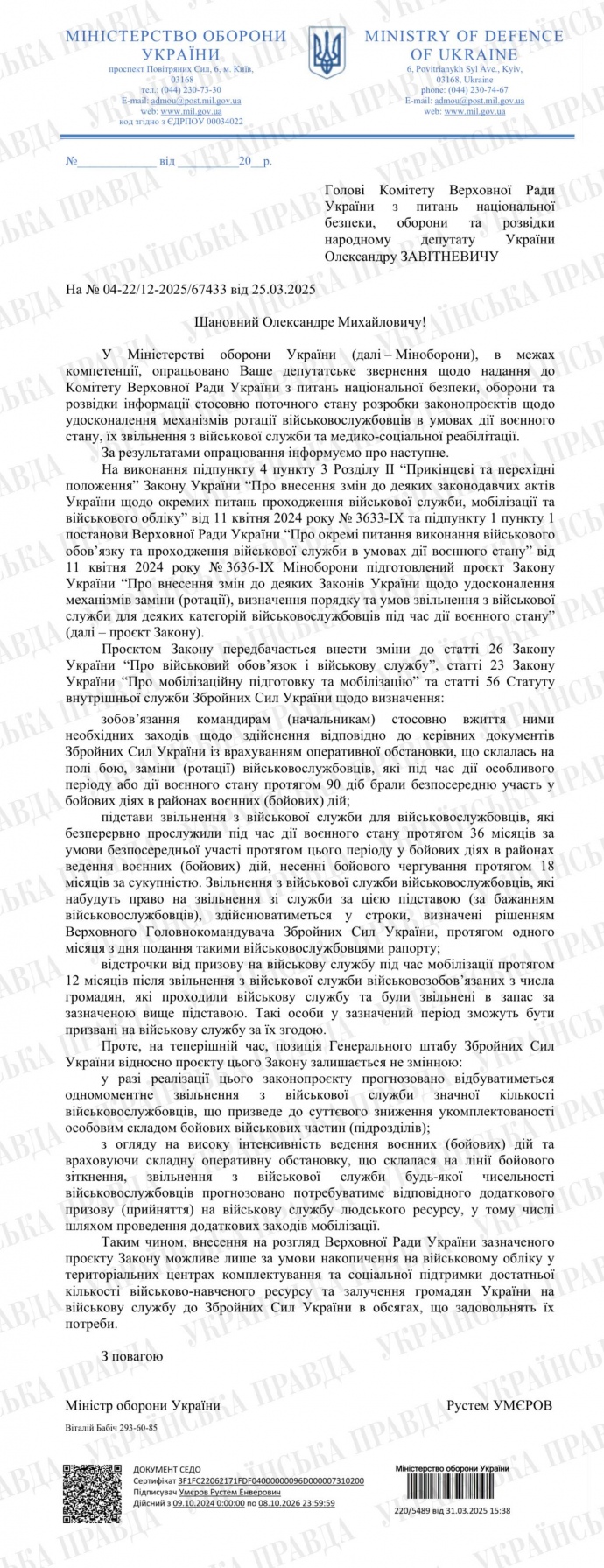 "Українська правда" актуалізувала свій запит до Міноборони щодо "демобілізаційного" законопроєкту 27 березня. Наразі відповідь не надійшла.