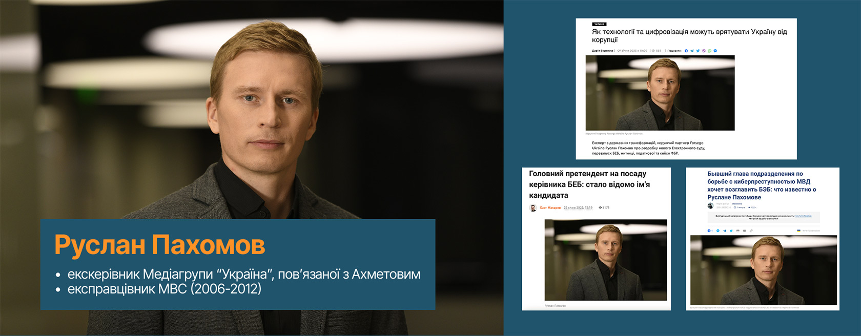 Також ми помітили публікації про нього компліментарного характеру в кількох інших медіа. Наприклад, "Oboz.UA" зробив окрему новину з "балотування" Пахомова на посаду. А видання "Главред" взагалі прямим текстом назвало Пахомова "головним претендентом на посаду керівника БЕБ".