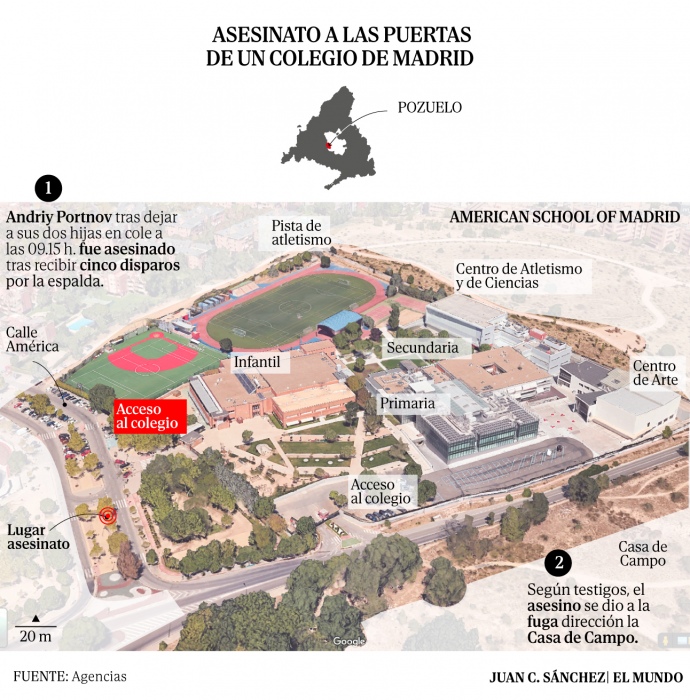 Вранці 21 травня поблизу елітної американської школи в Мадриді пролунали постріли. Поранений чоловік впав на землю. Очевидці відразу повідомили про інцидент поліції.