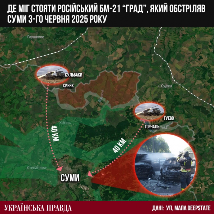 За даними УП у правоохоронних органах, удар "Градом" було завдано з території Росії (це ще раз підтверджує, що в захоплених росіянами селах на Сумщині немає важкої техніки, артилерії, РЗСВ тощо). Якщо відміряти по карті 30–40 кілометрів від точки прильоту в Сумах, виходить, що російський "Град" стріляв або з півночі – району російських сіл Сіняк, Кульбакі, Новоівановка, або зі сходу – району Гуєва, Горналі.