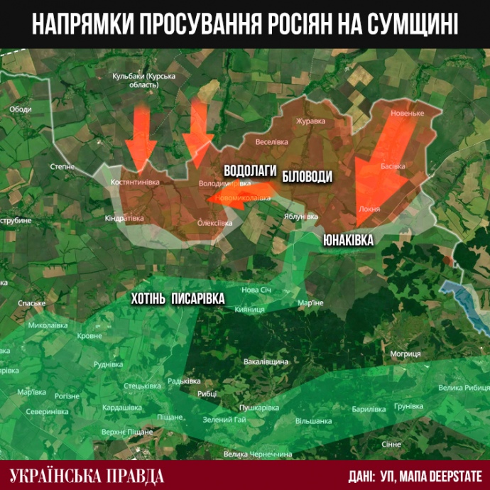 Відповіді на це запитання немає у жодного з наших співрозмовників. Єдине, у чому вони точно впевнені – наразі окупанти максимально розтягують фронт на Сумщині, щоб стягнути сюди побільше резерівів Сил оборони. Зокрема, вони посилено атакують у напрямку двох сіл – Писарівки та Юнаківки. Захоплення Писарівки дозволить окупантам перерізати основну дорогу від Сум до Юнаківки, а захоплення самої Юнаківки – отримати контроль над ключовим прикордонним населеним пунктом.