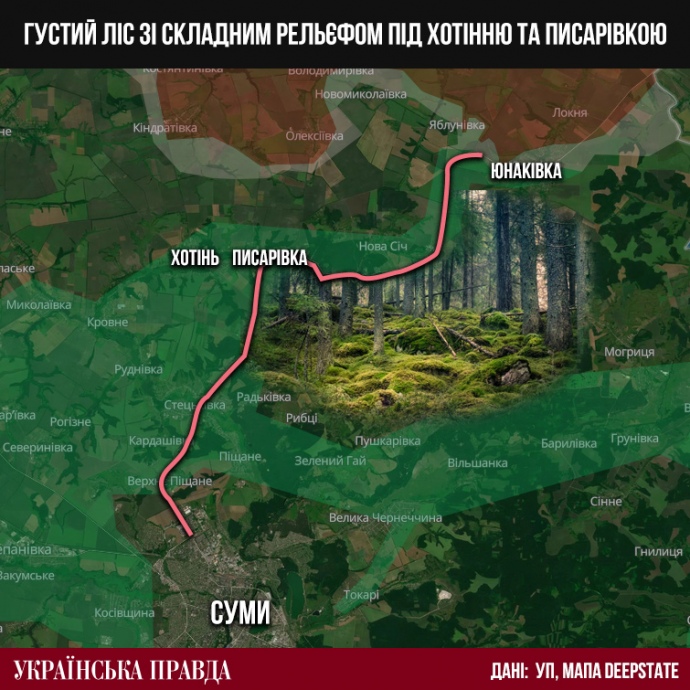 Також, як ми розуміємо з розмов із військовими, наразі важливо не допустити росіян в інший густий ліс, що розташований південніше від Хотіні та Писарівки. Вибивати противника з величезної "зеленки", яка маскує все, від пересувань до бліндажів, важко. Також у лісі складно працювати FPV-дронами, оскільки дерева заважають поширенню радіосигналу.