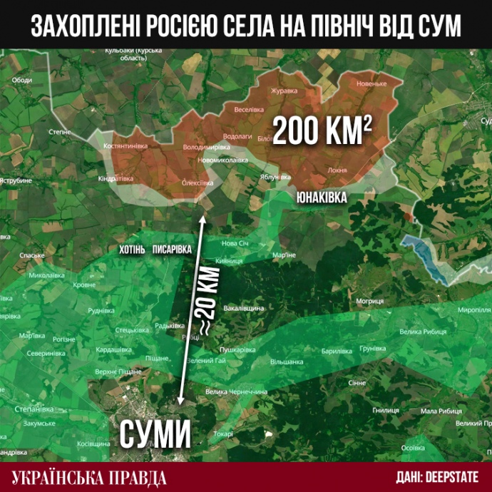 За ці понад три місяці російська армія захопила з десяток крихітних і невеликих сіл вздовж кордону на північний схід від Сум. Загальна площа захопленої території Сумщини, за даними DeepState, складає майже 200 квадратних кілометрів. Для порівняння, це приблизно п'ята частина території Курщини, яку Україні вдалося захопити під час наступу минулого літа. Чому окупантам вдалося це зробити, та що на цій захопленій ділянці відбувається зараз, ми опишемо нижче.