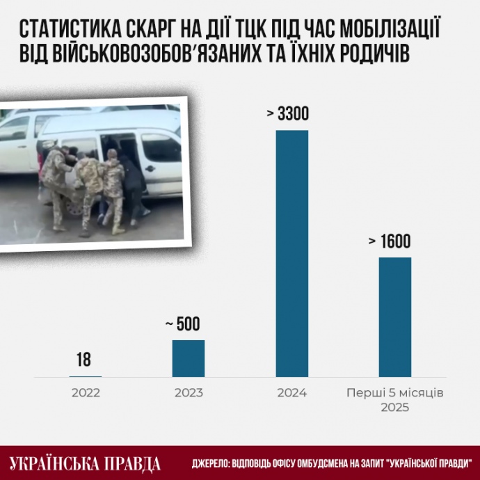 Із початку 2025-го до Офісу омбудсмена надійшло понад 1,6 тисячі скарг на дії ТЦК під час мобілізації від військовозобов'язаних і членів їхніх родин. За весь 2024-ий таких звернень було більше ніж 3 тисячі.