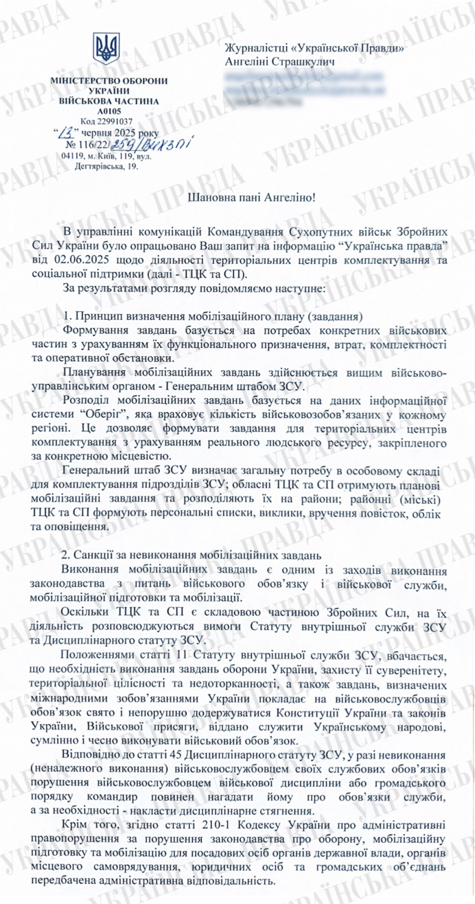 Розлога відповідь КСВ зводиться до одного: відповідальне за мобілізацію управління персоналу штабу КСВ у своїй роботі "керується виключно нормами законодавства, стандартами безпеки та здорового глузду".
