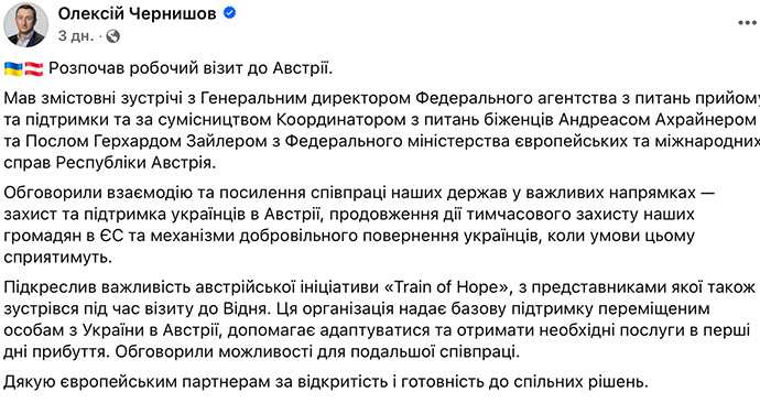 Обговорили взаємодію та посилення співпраці наших держав у важливих напрямках – захист та підтримка українців в Австрії, продовження дії тимчасового захисту наших громадян в ЄС та механізми добровільного повернення українців, коли умови цьому сприятимуть".