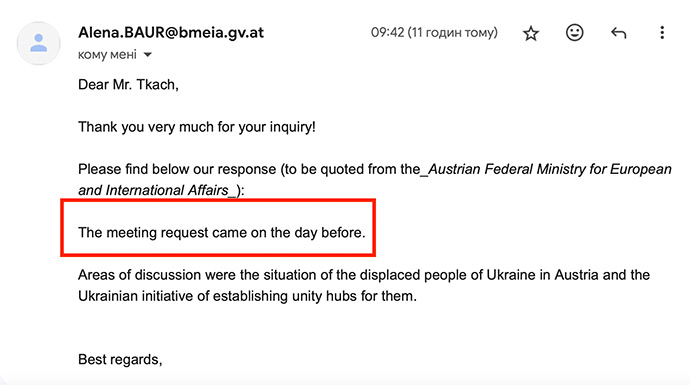 Редакція "Української правди" звернулась до всіх трьох організацій, з якими Чернишов мав зустрічі в австрійській столиці з питанням, коли саме представники міністра почали організацію цих зустрічей.
