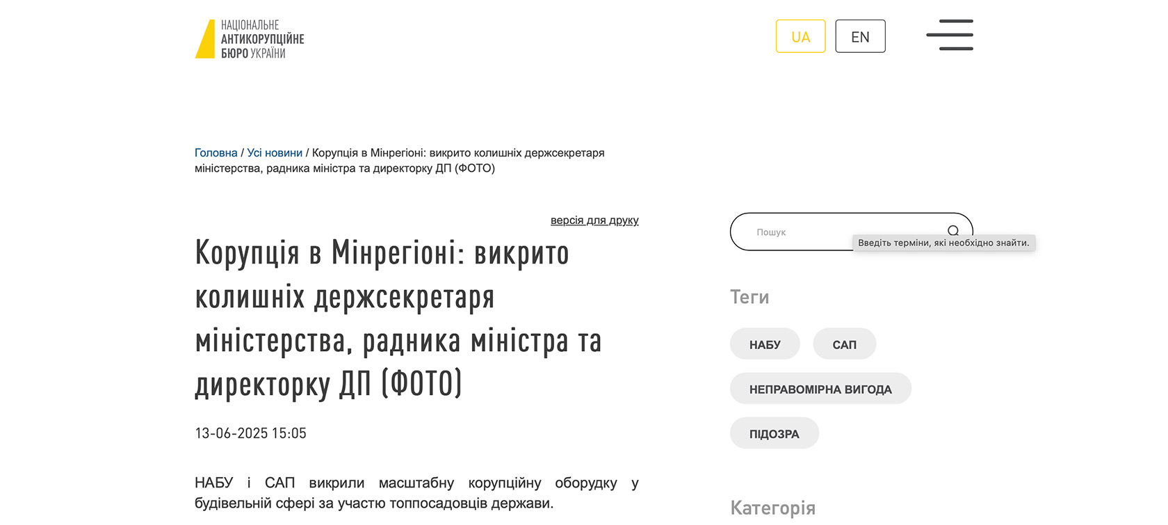 "Забудовник розробив схему незаконного одержання земельної ділянки у Києві під зведення житлового комплексу. Для цього звернувся до топпосадовців Мінрегіону, які створили умови для передачі землі підконтрольному держпідприємству. Воно ж у незаконний спосіб уклало з "потрібною" будівельною компанією інвестиційні договори.