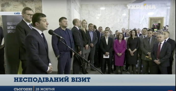 28 жовтня 2019 року. Після кількох місяців на посаді президент Володимир Зеленський приїхав до НАБУ, щоб виступити перед детективами: