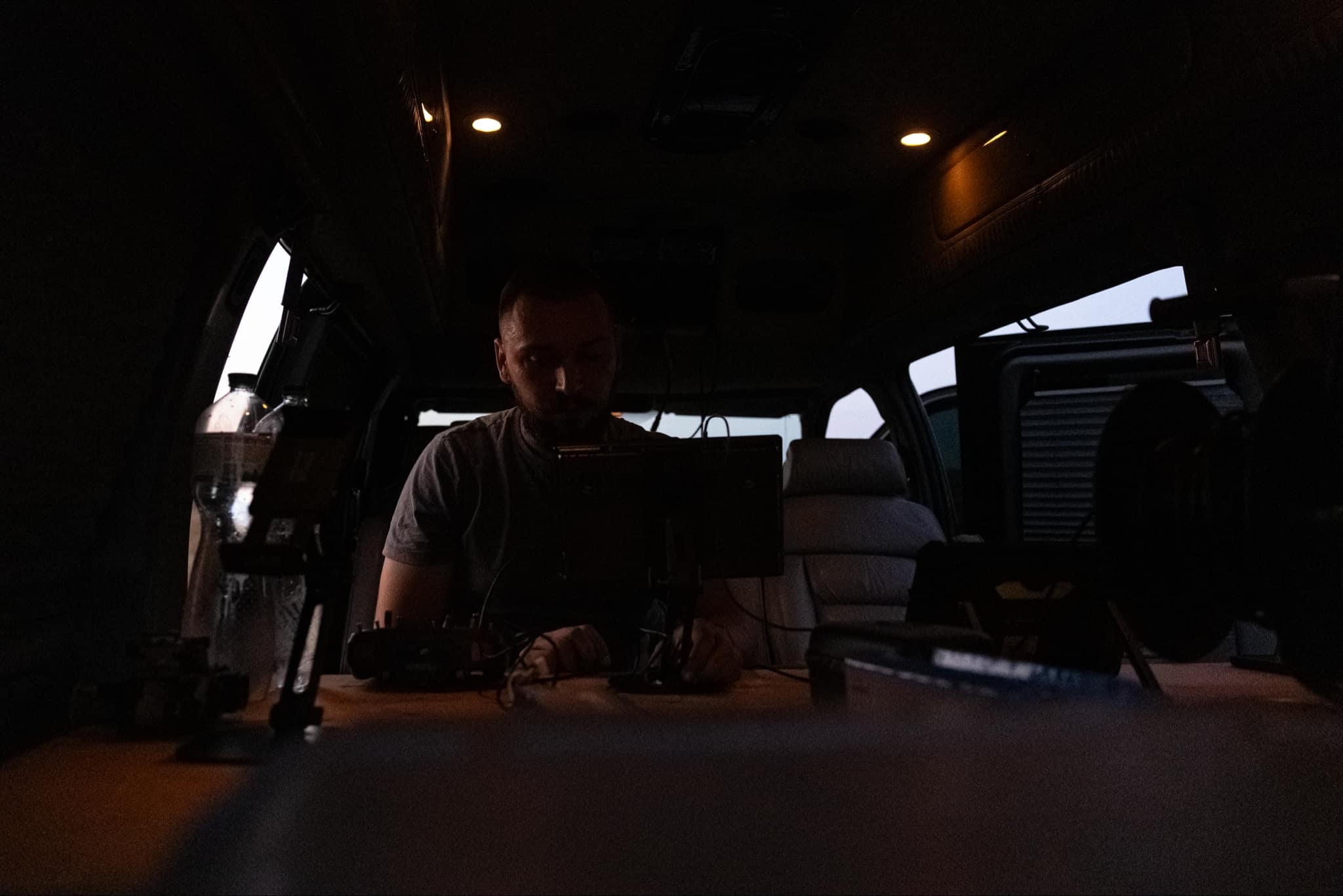 У бусі Signum'а є стіл, планшет, антена і нинішній ексклюзив – п'ять українських дронів-перехоплювачів у картонних коробках. Дрони-перехоплювачі здалеку нагадують крихітні ракети з чотирма двигунами. Хоча за своєю суттю, як пояснюють хлопці з дронових майстерень Signum, вони є всього-на-всього нестандартною моделлю FPV-дрона.