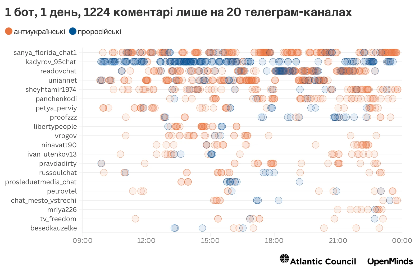 Влітку цього року дослідницькі команди OpenMinds та DFRLab, що спеціалізуються на аналізі дезінформації та онлайн-маніпуляцій, виявили і дослідили понад 3600 ботів у Telegram-каналах окупованих територій України.