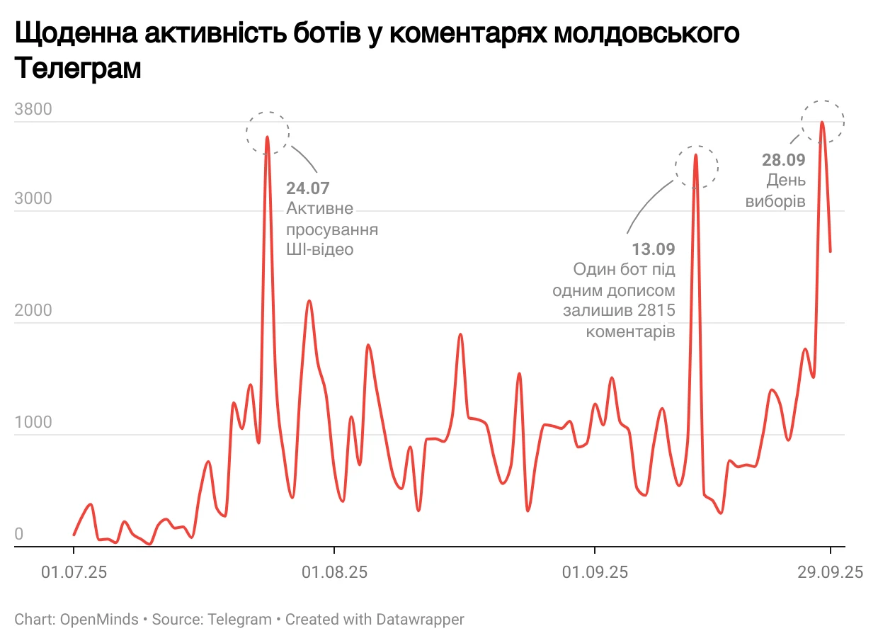 Напередодні парламентських виборів у Молдові 28 вересня цього року та сама ботоферма "зайшла" в молдовський Telegram. Як наслідок – за 4 місяці до голосування кожен восьмий коментар в місцевих суспільно-політичних каналах був згенерований ботом.