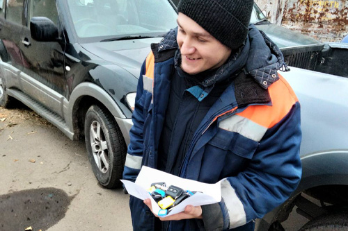 Співробітник Укрзалізниці, яка допомагає нам з перевезенням військових машин. В його руках - ключі від десятка пікапів