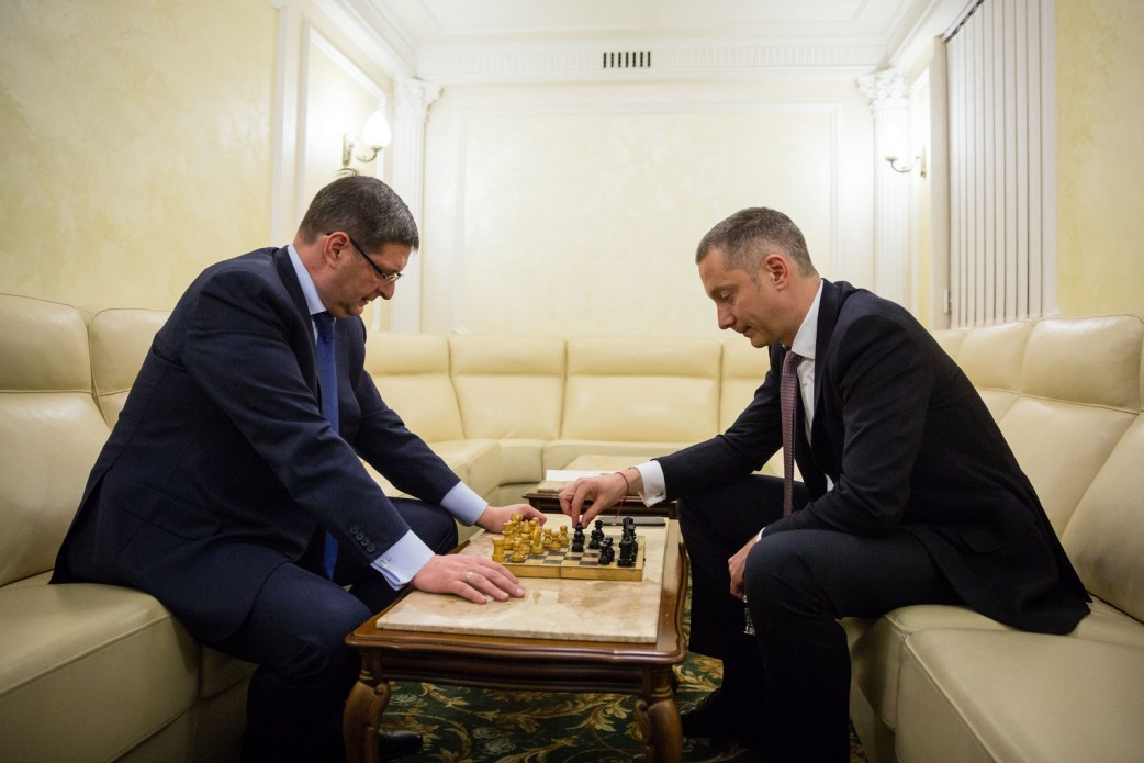 Vitaliy Kovalchuk (to the left) and Borys Lozhkin playing chess in the Administration building