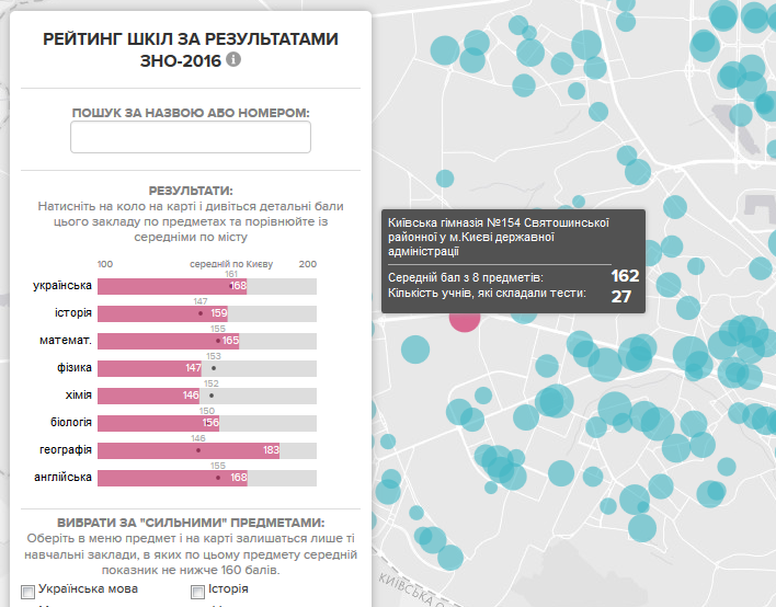 Для того, щоб зробити пошук найкращих навчальних закладів для вас легшим, "Українська правда" розробила інтерактивну карту. На ній кожен навчальний заклад позначений колом. Чим більше коло – тим вищий середній бал цієї школи за ключовими предметами. Ви легко зможете дізнатися, де краще отримувати знання майбутнім математикам та фізикам або відшукати найкращу школу для дитини у вашому районі.